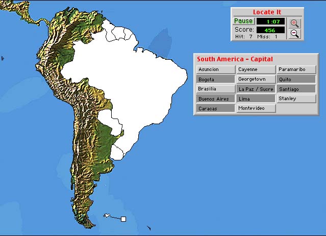 Learn South American capitals by clicking on the correct country, viewed as a Topo map